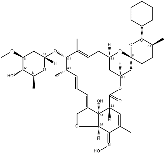Selamectin is a semi-synthetic avermectin derivative prepared by selective hydrolysis and oximation of doramectin. Selamectin is a potent nematocide used for the treatment of endo- and exo- parasites of domestic animals, notably cats and dogs. Like the other milbemycin/avermectins, selamectin selectively binds to parasite glutamate-gated chloride ion channels and disrupts neurotransmission leading to paralysis and death of the parasite.